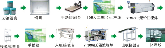 Artificial patch production line The artificial patch production line is mainly a manually simulated patch nozzle. The air pressure difference (reverse vacuum) generated by the manual patch pen itself is used to directly suck the patch component from the tape, and then the component is manually placed. In the corresponding PADS position, the artificial patch force is less than the sticking force of the solder paste (adhesive glue) through the adjusted air pressure suction, and the components are automatically placed on the corresponding PADS. |