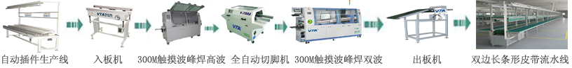 Automatic plug-in line 1. Unilateral operation: 2.4-3.0m/segment 2. Working surface height: 750±15mm 3.PCB width: 50-300mm continuously adjustable 4. Conveyor chain: 3/8" imported high quality nylon plastic chain 5. Drive system: WTW 60W speed motor 6. Conveying speed: 0.5-1.8m/min 7. Tripods light stand: 40*40 iron (aluminum square pass surface spray (computer gray) 8. Body size (single unit): L3000*W600*H2000mm 9. Power supply: single phase 220V Configuration 1. Lighting: 30W single-bracket hood light distribution tube 2 2. Process kanban: 15X25 aluminum profiles, each with 6 300X400 transparent acrylic plates 3. Parts table: 1.5mm iron plate bending forming (two layers) |