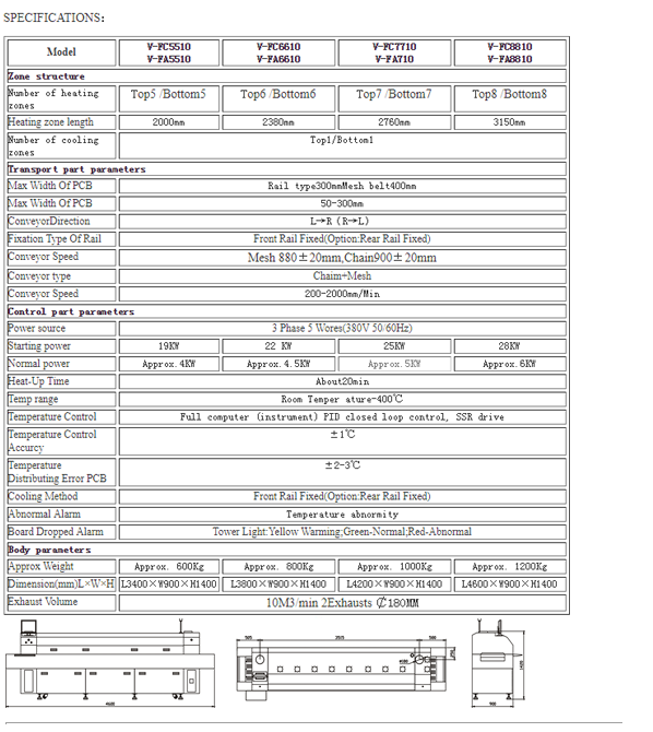 Profile:Features: • Adopt brand LCD computer + PLC intelligent control system, the temperature control accuracy is ±1°C (if the computer crashes unexpectedly, it can realize offline work without affecting production), and ensure the control system is stable and reliable; • Windows2000 operation interface, powerful and easy to operate; • The upper furnace is opened with a double cylinder lifting machine to ensure safety and reliability; • Equipped with mesh belt tensioning device, the transportation is stable, no jitter, no deformation, ensuring smooth PCB transportation; • Synchronous rail transmission mechanism (can be connected to the automatic placement machine) to ensure accurate and high service life of the guide rail; (optional rail) • Automatically control the lubrication system, which can automatically lubricate the transmission chain by setting the refueling time and fueling amount; • All heating zones are PID controlled by the computer (can be opened separately in the temperature division zone. Partition heating can be used to reduce the starting power);
