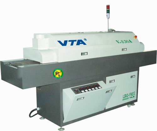 8.加熱係(xì)統采用高效節能的瑞典鎳烙發熱管,輻射功率(lǜ)峰值波長4UM,配合曲麵反射罩,熱效率高(gāo),升溫度(dù)速度快,特製強製熱風(fēng)循環結構係統,使PCB及元(yuán)器件受熱均勻(yún),完(wán)全消除“陰影效應”。